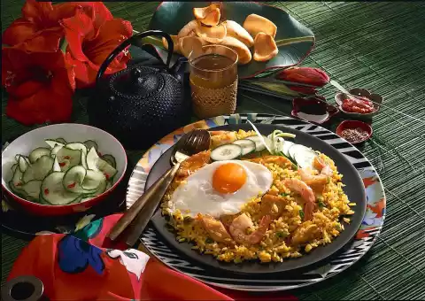 Garnish with remaining spring onion and cucumber slices. Sambal Oelek, Sambal Nasi Goreng and Ketjap Asin are enough to season. Serve with kroepoek and cucumber salad.