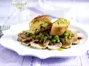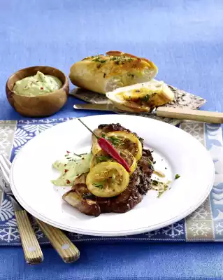 Cut the baguette at a distance of 1.5 cm. Cut butter into thin slices and fill them into the spaces between the baguettes. Sprinkle with half of the parsley. Bake the baguette in a preheated oven (electric cooker: 175 °C/ convection oven: 150 °C/ gas: level 2) for approx. 5 minutes. In the meantime, remove the meat from the marinade and let it drip off a little. Heat 2 tablespoons of oil in a frying pan, fry the steaks over medium heat while turning for approx. 10 minutes. Take out the baguette in the meantime. Remove the meat and season with salt and pepper. Wash the lemons thoroughly and grate them dry. Put 1 tablespoon of oil into the pan. Cut the lemons into slices and fry them in the pan for about 3 minutes, turning them over and taking them out. Arrange chops on plates and cover with fried lemon slices. Sprinkle with remaining parsley and garnish with chillies if necessary. Add guacamole and baguette