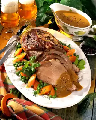 The next day, heat oil in a roaster and place the meat without marinade. Salt the meat and roast it in a preheated oven (electric cooker: 175 °C/ gas: level 2) for 1 1/2 - 1 3/4 hours. Clean, wash and roughly cut the soup greens into pieces. If necessary, put some celery green aside for garnishing. After 20-30 minutes, add the vegetables together with the marinade and 1/4 litre of broth to the roast and braise. In the meantime clean, wash and slice the carrots diagonally. Cook the carrots in little boiling salted water for about 15 minutes. Add frozen peas 5-6 minutes before the end of the cooking time and cook at the same time. Wash parsley, dab dry and chop. Pour the vegetables onto a sieve and drain. Heat the fat in the pot, toss the vegetables and parsley in it. Keep warm.