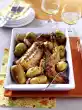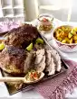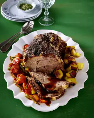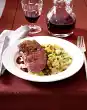 Cut the meat and arrange it on a plate with potatoes and vegetables. Pour some sauce over the meat and add the rest of the sauce.