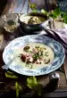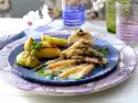 Wash the potatoes and cook in boiling water for about 20 minutes. Drain the potatoes and let them cool down a little. Peel potatoes and cut into pieces. Wash and clean the zucchini, cut in half lengthwise and cut into slices.