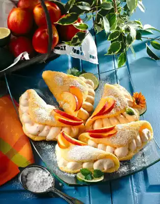 Whip the cream until stiff. As soon as the fruit puree begins to gel, fold in the cream. Pour the cream into a piping bag with perforated spout. Fill omelettes with it and put them in a cool place for about 1 hour. Dust with diabetic sweetener and decorate with nectarine slices