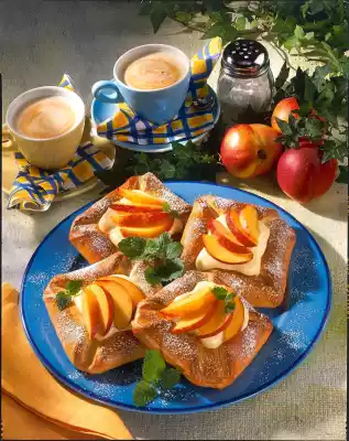 Roll out the dough on a little flour about 1/2 cm thick (about 30 x 30 cm) and cut into 4 squares. Fold the dough corners towards the middle. Place on a baking tray lined with baking paper. Bake in the pre-heated oven (electric cooker: 200 °C/circulating air: 175 °C/gas: level 3) for 12-15 minutes. Let them cool down