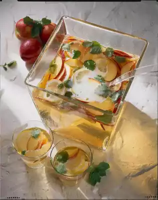 Pluck the lemon balm leaves from the stalks. Put the nectarines, lemons and lemon balm into a large punch bowl. Mix juice and wine and pour on. Pour on the champagne just before serving