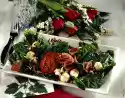 Clean and wash the rocket and dab dry. Divide noodles into 4 portions and form noodle nests. Spread the rocket on plates and place the noodle nests on top. Pull the fish pieces apart and put them into the noodle nests. Spread the vinaigrette over the pasta and sprinkle with pink peppercorns. Garnish with basil and serve