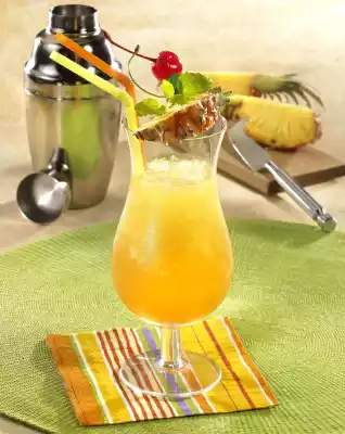 Shake Southern Comfort, Bourbon Whisky, Amaretto, orange juice, lemon juice and ice cubes well in a shaker. Pour crushed ice into a long drink glass and pour cocktail on top. Decorate with a slice of pineapple, red and green cocktail cherries and lemon balm