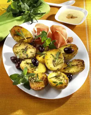 Arrange potatoes, olives and Parma ham on a plate. Serve garnished with oregano, rosemary, parsley and thyme. Add aioli to taste with slices of roasted garlic extra.
