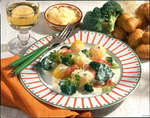 Melt half of the grated cheese in it. Sprinkle with sauce thickener, bring to the boil again briefly. Season with salt, pepper, nutmeg and stock. Wash, chop and stir in the parsley. Heat broccoli and ham in the sauce.