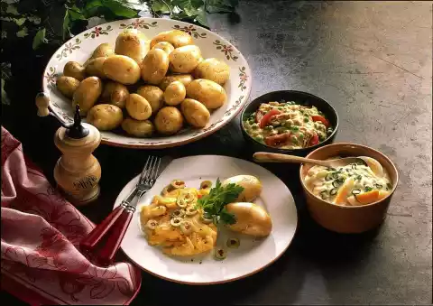 Wash potatoes thoroughly and cook in boiling salted water for 20 minutes. For the cream cheese dip, boil eggs hard, quench and peel. Cut eggs into slices. Clean and wash spring onions and cut into rings.