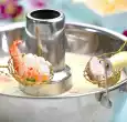 In the meantime, prepare the remaining fondue ingredients and fill into small bowls: Chicken breast and beef fillet, salmon fillet, rinse cold or pat dry. Cut each into cubes of approx. 2 cm. Rinse raw prawns (without head and shell) in cold water and pat dry.