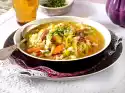 Clean or peel and wash the soup vegetables. Cut into small pieces. Wash and quarter the tomatoes. Onions wash and halve. Put the soup vegetables, tomatoes, bay leaf, peppercorns, 2 tsp salt and 1 tsp sugar in a large pot.