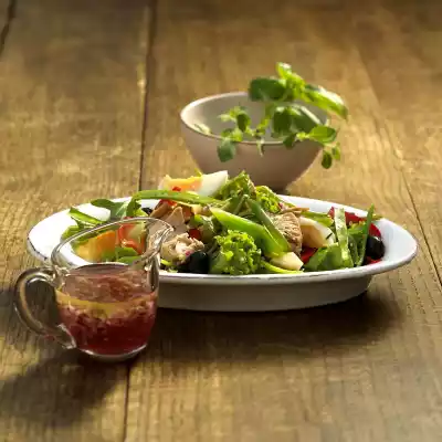 Drain the tuna, chop it lightly. Mix all ingredients and marinate with the vinaigrette.