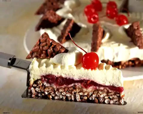 If necessary, smooth it down with a cake comb. Spray the rest of the cream as 12 tuffs. Chill for about 2 hours. Remove the cake from the edge of the mould. Carefully halve the remaining rice snacks. Decorate the cake with snacks, possibly cocktail cherries and lemon balm