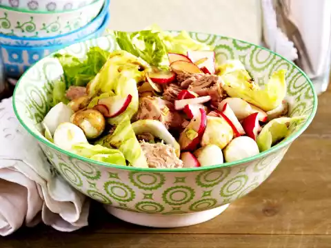 Drain the tuna. Mix salad, radishes, mozzarella, tuna and vinaigrette, season again and arrange in small bowls. Bread tastes good with it