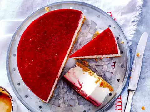 For the topping, select the raspberries, wash them if necessary and let them drip off on kitchen paper. Finely mash the berries. Stir in 1 sachet of "Gelatine fix" and continue stirring for about 1 minute. Stir in 1 tablespoon of sugar. Add the raspberry topping to the yoghurt cream. Chill the cake for about 3 hours.