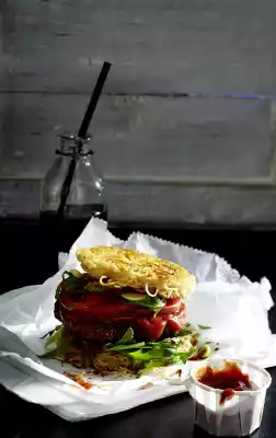 Cover 4 pasta cakes with 1 burger each. Spread ketchup, tomato slices, spring onions and rocket on top. Cover with the remaining noodle. Serve immediately.