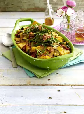 In the meantime, sort out the rocket, wash, drain well and chop into small pieces. Break the bacon into small pieces. Mix both with vinegar and 1 tsp olive oil. Take the casserole out of the oven. Spread the rocket and bacon mixture over it and serve immediately.