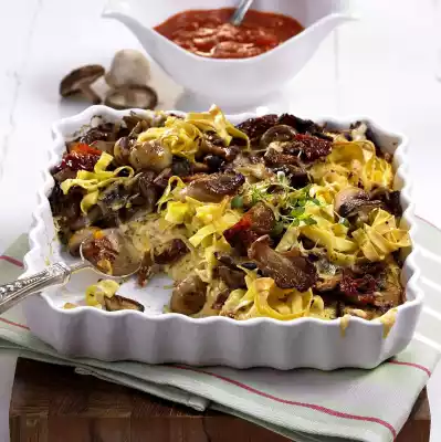 Place the pasta as nests in a greased casserole dish. Spread the mushroom mixture in the dish. Pour egg milk over it, sprinkle with cheese. Bake in the preheated oven (electric cooker: 200 °C/ convection oven: 175 °C/ gas: level 3) for 30-35 minutes.