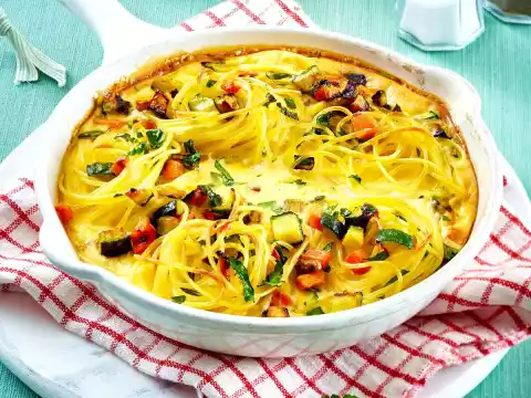 Drain the spaghetti and let it drain well. Mix spaghetti and vegetables and put them into an ovenproof pan (18 cm Ø). Wash parsley, shake dry, pluck leaves and chop finely.