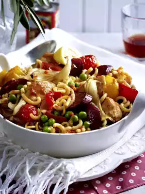 Pour in hot aiwar broth, add noodles, frozen peas and thyme, bring to the boil while stirring. Fold in meat and slices of sausage. Cover and cook in a preheated oven (electric cooker: 200 °C/ convection oven: 175 °C/ gas: see manufacturer) for approx. 20 minutes. Stir once in between