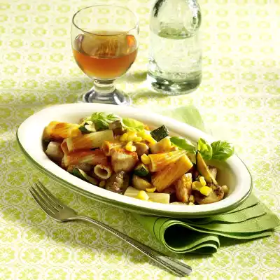 Cook the pasta in boiling salted water according to the instructions on the packet. Heat the oil in a frying pan. Fry meat while turning for approx. 8 minutes while turning. Add vegetables after 5 minutes. Season with salt and pepper.