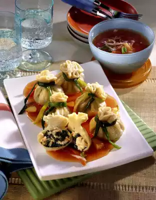 Mix salmon and spinach. Put about 1 tablespoon of filling in the middle of each circle. Spread the edges of the circles with egg white and press them together to form small bags. Knead the dough again and roll out until dough and filling are used up. Results in 22-24 noodle packs. Bring a large pot of salted water to the boil. Cut the remaining spring onions into fine, long strips and blanch briefly in boiling water. Quench cold, drain and tie 1 strip around each packet. Put the packet into boiling water and simmer gently for about 12 minutes. In the meantime heat up the oil in a pan. Fry the carrot, pineapple and spring onion rings briefly. Finally, fry the sprouts and remaining garlic briefly. Deglaze with stock and sweet and sour sauce, stir in ketchup and bring to the boil. Mix pineapple juice and starch, stir into the sauce and bring to the boil again briefly. Season sauce with chilli powder and soy sauce. Drain the pasta packs well and serve with the sweet and sour vegetable sauce