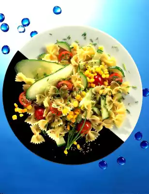 Cook the pasta in plenty of boiling salted water for ten minutes. In the meantime, wash the cucumber thoroughly, cut in half lengthwise and slice. Wash and halve the tomatoes. Drain the corn. Drain the pasta, chill and let it cool down.