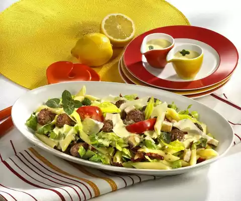 Form into small balls with wet hands. Fry in hot oil all around for about 4 minutes. Drain the noodles and let them drain. Cut dried tomatoes into fine strips. Clean, wash and cut the romaine lettuce into strips. Slice Parmesan finely. Peel garlic, press through a garlic press. Mix with mayonnaise, mustard and vinegar. Season with salt and pepper. Carefully mix prepared salad ingredients and sauce.