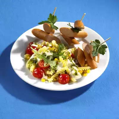 Wash the tomatoes, dab dry and cut in half. Cut the long stems from the rocket, sort the rocket, wash and drain. Wash parsley, dab dry and remove the leaves. Mix the corn, tomatoes and rocket with the pasta salad and season again with salt and pepper. Put the sausage in hot water and heat it up. Cut the sausages diagonally into pieces and put them on skewers with parsley leaves. Serve the pasta salad together with the sausage skewers