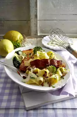 Pluck off leaves and chop finely. Coarsely chop the smoked almonds. Mix about 2/3 of the parsley into the noodles. Mix honey and Sambal Oelek. Remove the pan from the heat and brush the salmon with it. Serve the noodles with salmon and broccoli.