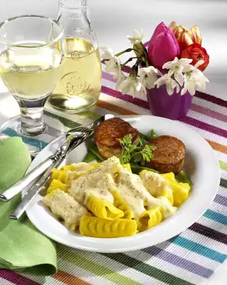 Bring to the boil again and add gorgonzola. Season with salt, pepper and nutmeg. Melt the cheese in the sauce and let the sauce boil down at low heat for about 10 minutes. In the meantime heat oil in a pan and fry medallions for 6 minutes on each side.