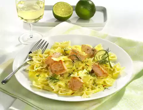 Season with pepper. Stir saffron into the sauce and season with salt, pepper and Pernod. Add salmon cubes to the hot sauce. Wash the dill, dab dry and chop finely, except for a little for garnishing. Drain the pasta, rinse briefly in cold water and drain. Arrange noodles and sauce on 4 plates. Garnish with dill and lime slice. Serve sprinkled with dill