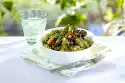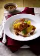 Add fish stock, white wine and cream while stirring. Bring to the boil and simmer for about 5 minutes, stirring in between. Put the pasta in plenty of boiling salted water and cook according to the package instructions (in this case 10 minutes). Drain the fish. Heat 20-30 g fat in a coated pan and fry the salmon for approx. 4 minutes, turning it over. Season with pepper. Stir saffron into the sauce and season with salt, pepper and Pernod. Add salmon cubes to the hot sauce. Wash the dill, dab dry and chop finely, except for a little for garnishing. Drain the pasta, rinse briefly in cold water and drain. Arrange noodles and sauce on 4 plates.