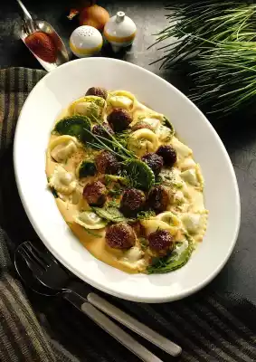 Serve the sauce with the noodles and meatballs. Wash the chives and, except for a few longer tips for garnishing, cut into fine rolls. Noodle plate with Schn