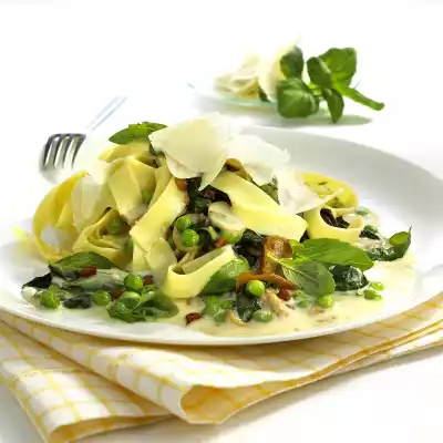 Fry the mushrooms for 2-3 minutes. Add bacon and diced onion, fry until crispy. Season with salt and pepper. Dust with flour, add peas. Deglaze with cream and broth. Bring to the boil while stirring constantly and let simmer for 2-3 minutes. Wash basil, dab dry, pluck leaves, possibly cut a little smaller. Stir 3/4 into the sauce, season again. Mix pasta and sauce and serve.