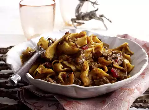 Cook the pasta in plenty of boiling salted water according to the instructions on the packet. Season ragout with salt and pepper. Drain the noodles, put them back into the pot and mix with the ragout. Serve.