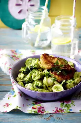 Cook the pasta in boiling salted water according to the instructions on the packet. Peel garlic and chop roughly. Coarsely grate cheese. Finely puree garlic, cheese, pine nuts, half broccoli and oil (see picture on the right).