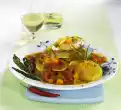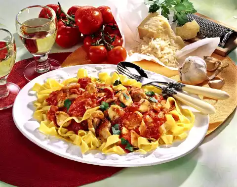 Meanwhile cook the noodles in boiling salted water for about 8 minutes. Wash the chicken fillets, dab dry and cut into thin slices. Heat 1 tablespoon of oil in a frying pan and fry the chicken strips in it in portions. Season with salt and pepper. Remove and add to the tomato sauce. Wash the parsley, dab dry, pluck and chop coarsely. Season tomato sauce with salt and pepper. Drain the pasta, sprinkle with the remaining oil and arrange on a plate with the chicken shredded. Sprinkle with parsley and garnish with remaining chillies.