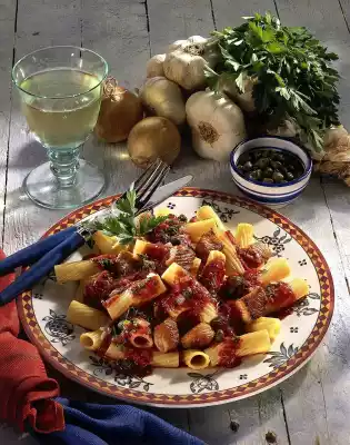 Heat oil in a pan. Fry the onion cubes and garlic briefly. Add the diced meat and fry over medium heat until golden brown all around. Add tomatoes and capers and bring to the boil while stirring. Season to taste with salt, pepper and Sambal Oelek. Wash the parsley and dab dry. Pluck the leaves from the stalks and chop finely, except for a few for garnishing. Sprinkle over the sauce. Drain the noodles and let them drain briefly.