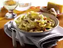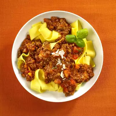 Cut the rest into fine strips. Stir the sauce thickener into the minced meat sauce, simmer for about 1 minute. Season to taste with salt and pepper. Mix in basil. Drain the pasta and let it drain. Serve pasta with the sauce. Sprinkle with parmesan and garnish with basil
