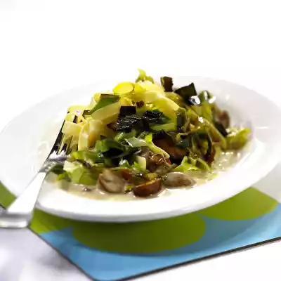 Prepare the pasta in boiling salted water according to the instructions on the packet. Meanwhile clean and wash the leek and mushrooms. Halve the mushrooms and cut the leek into fine rings. Heat the oil.