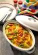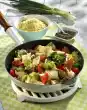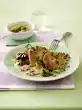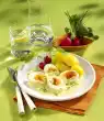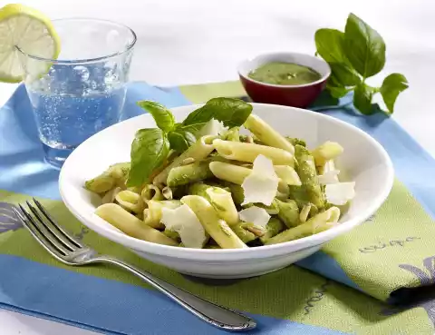 Prepare the pasta in boiling salted water according to the instructions on the packet. Puree basil, 50 g Parmesan, yoghurt, olive oil, 30 g pine nuts and garlic in the universal chopper, season with salt, pepper and a little sugar.