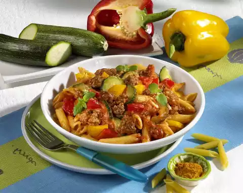 Peel and finely dice the onion and garlic. Clean, wash and cut the peppers into small pieces. Clean, wash, halve and slice the zucchini. Put pasta in boiling salted water and cook for about 10 minutes.