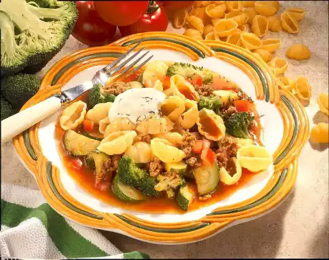 Cook the pasta in salted water for 12 minutes. Steam broccoli florets for about 6 minutes. Fry minced meat in oil in a coated pan, season. Dice zucchini and tomato and fry. Stir in tomato paste and 6 tbsp. water.