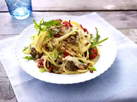 Season to taste with salt, pepper and lemon juice. Add pasta, meatballs and tomatoes, heat up again briefly. Mix in the rocket. Arrange on plates.
