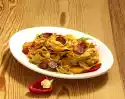 Put 2 tablespoons of oil into the bacon pot. Melt the tomatoes briefly while turning them and take them out. Add spring onions to the frying fat and fry. Add bacon again, deglaze with cream, bring to the boil. Add parmesan cheese and cream cheese and heat while stirring.