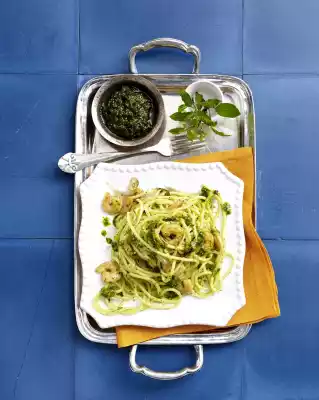 Mix the pasta water and 5 tablespoons pesto. Add the mixed pesto and prawns to the pasta and fold in. Serve the pasta and add the remaining pesto. If pesto is left over, it can be kept in the refrigerator for 1-2 weeks.