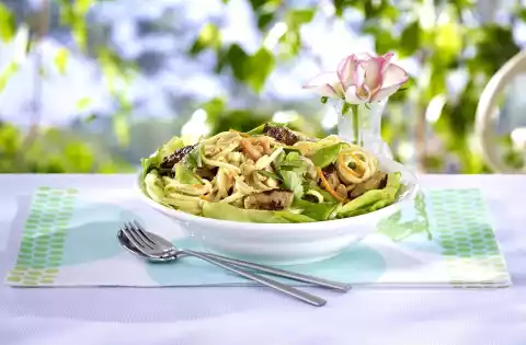 Wash the coriander, shake dry and cut coarsely. Chop the peanuts. Arrange noodles on some lettuce leaves in a bowl, sprinkle with coriander and peanuts