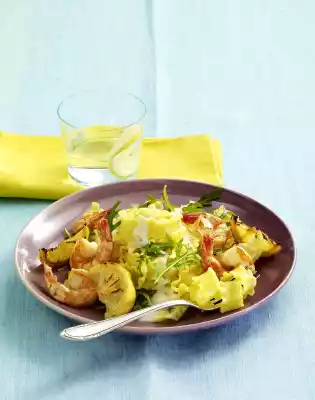Wash shrimps and pat dry. Melt butter in a small pot. Stir in flour and sweat for 1-2 minutes while stirring. Mix fish stock and milk and stir into the flour. Simmer sauce while stirring for about 1 minute, then add cognac and season to taste with salt and some lemon juice (from a crevice). Prepare noodles in boiling salted water with turmeric according to package instructions. Heat oil in a large pan. Put shrimps and lemon wedges in the hot pan and fry for 3-5 minutes, turning occasionally. Season with salt and pepper. Add the garlic 1 minute before the end of cooking.