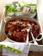 Put 2 tablespoons of oil in the hot pan, fry the pumpkin, onion and garlic in it while turning. Add broth, ketchup and oregano, bring to the boil, cover and braise for about 5 minutes. Pour pasta onto a sieve and drain. Pluck ham slices into pieces. Put tomatoes back into the pan, bring to the boil and season with salt and pepper. Mix the pumpkin and tomato ragout with the noodles and arrange on deep plates. Spread ham on top and garnish with oregano
